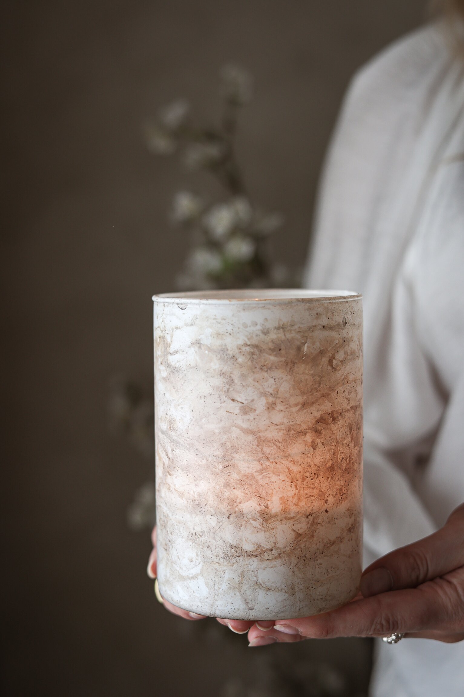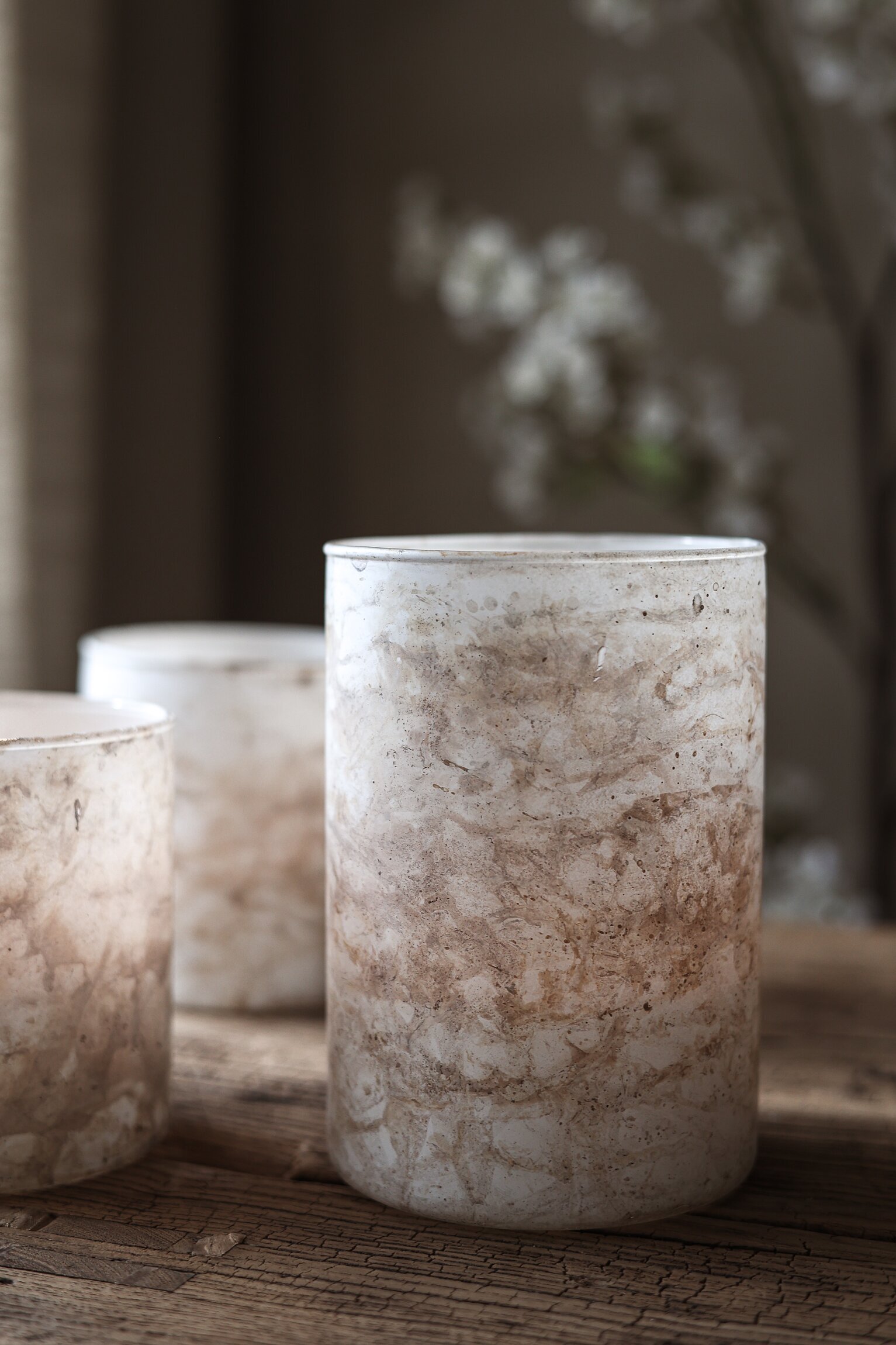 Varje lykta är handgjord i glas och har en vacker, levande finish i toner av vitt, sand och grått. Det ger ett mjukt och stämningsfullt ljus som skapar en varm känsla i rummet.