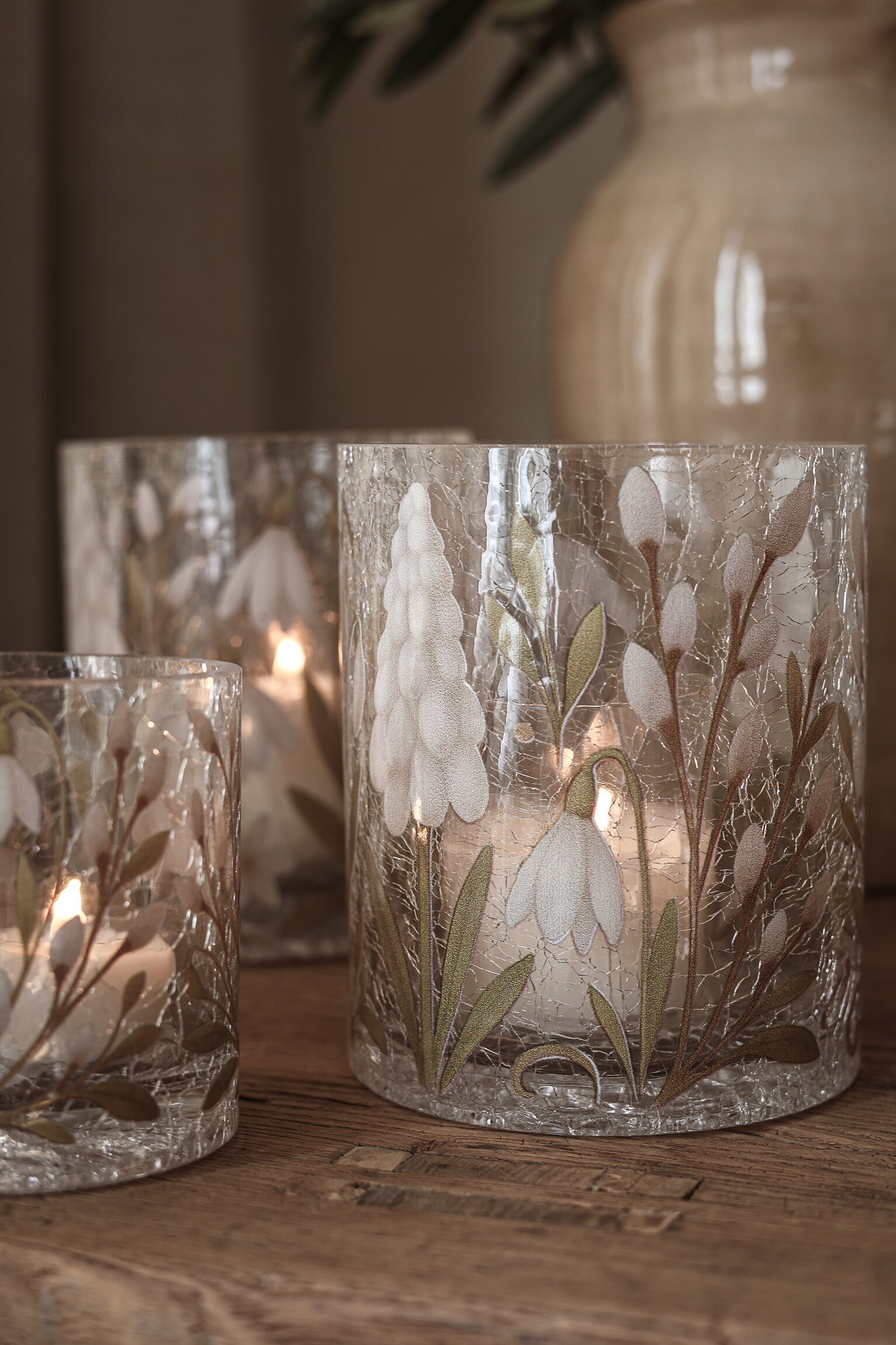 Vacker ljuslykta, handgjord i krackelerat glas och dekorerad med vackra pärlhyacinter, videkvistar och snöklockor. Varje lykta är unik, med små variationer i glasets tjocklek och sprickor, vilket ger en charmig och levande känsla.