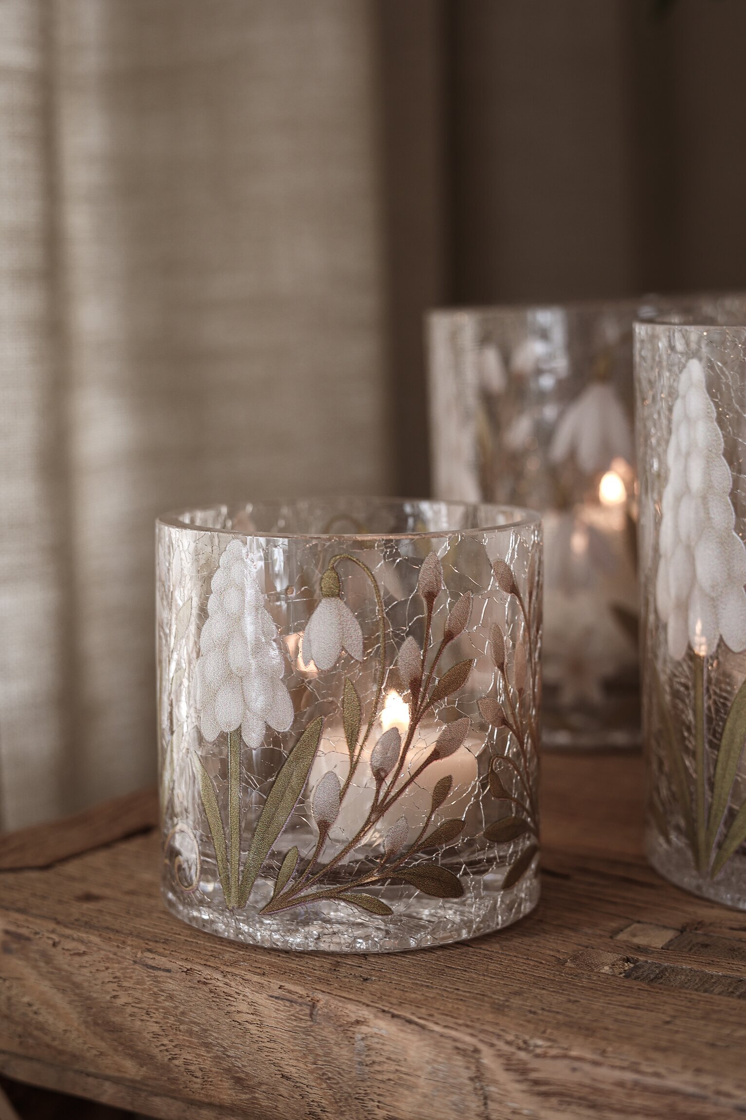 Vacker ljuslykta, handgjord i krackelerat glas och dekorerad med vackra pärlhyacinter, videkvistar och snöklockor. Läs mer