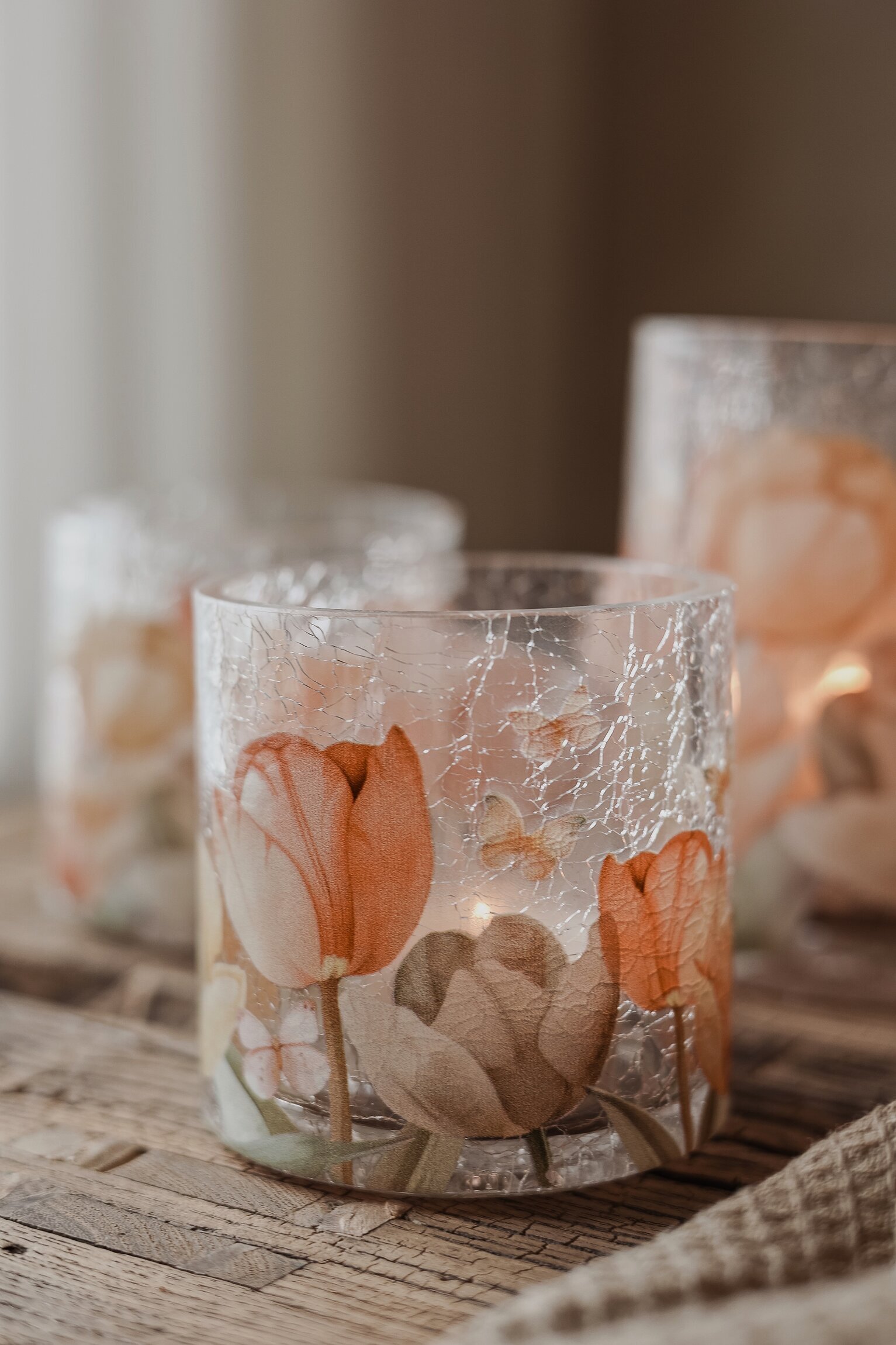 Vacker ljuslykta, handgjord i krackelerat glas och dekorerad med vackra tulpaner. Varje lykta är unik, med små variationer i glasets tjocklek och sprickor, vilket ger en charmig och levande känsla.