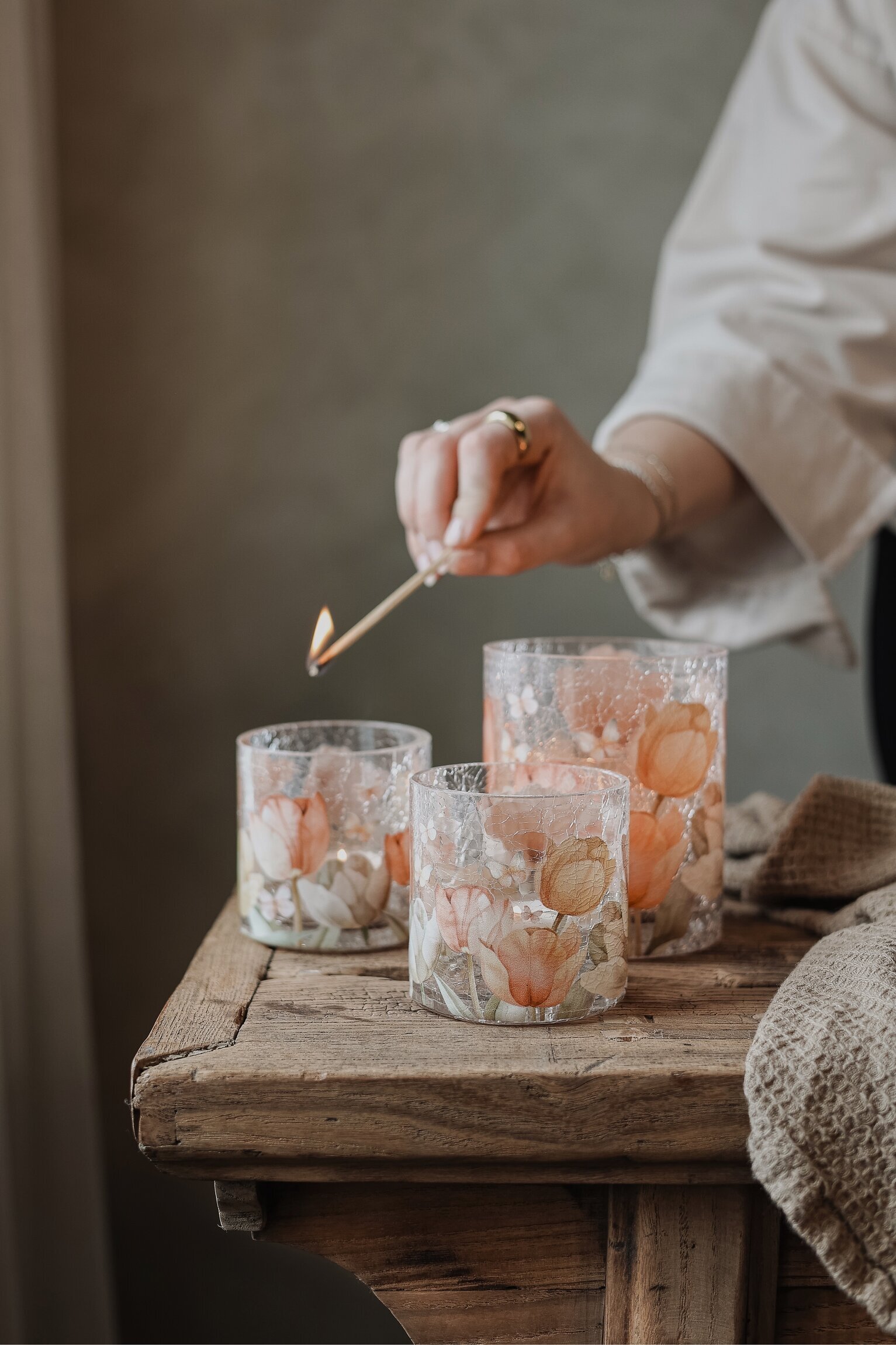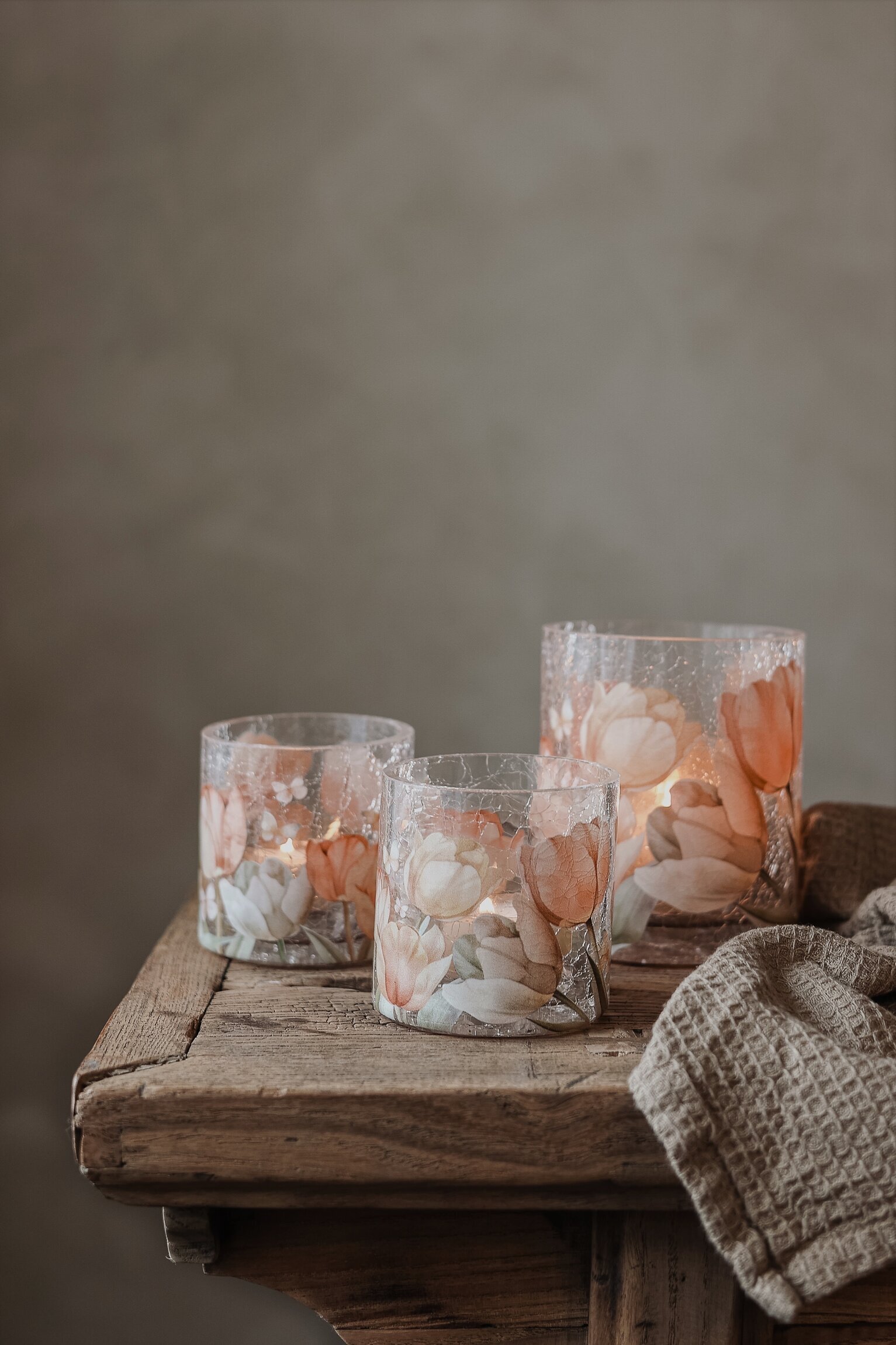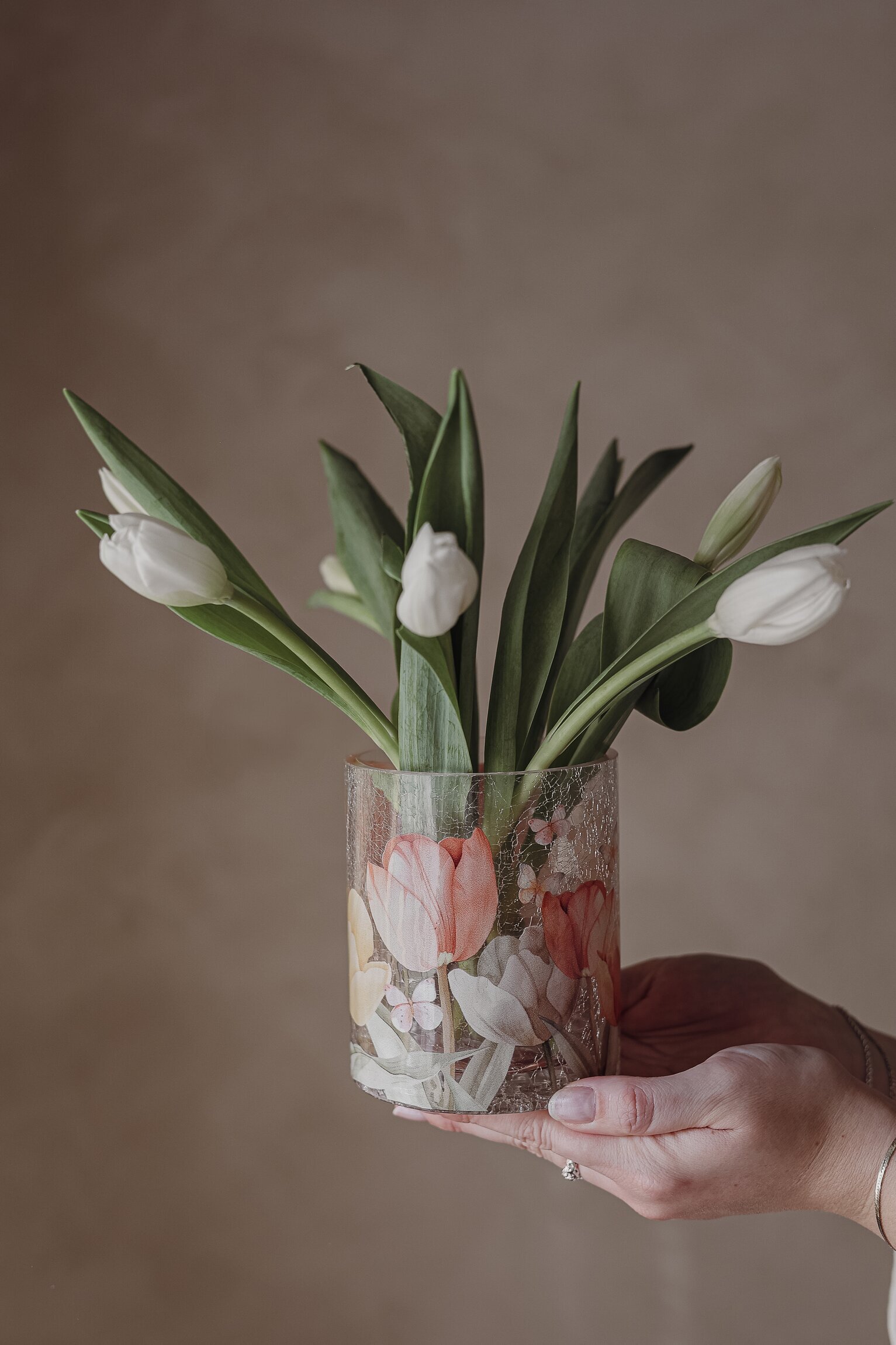 Vacker ljuslykta, handgjord i krackelerat glas och dekorerad med vackra tulpaner, från Majas Cottage. Läs mer
