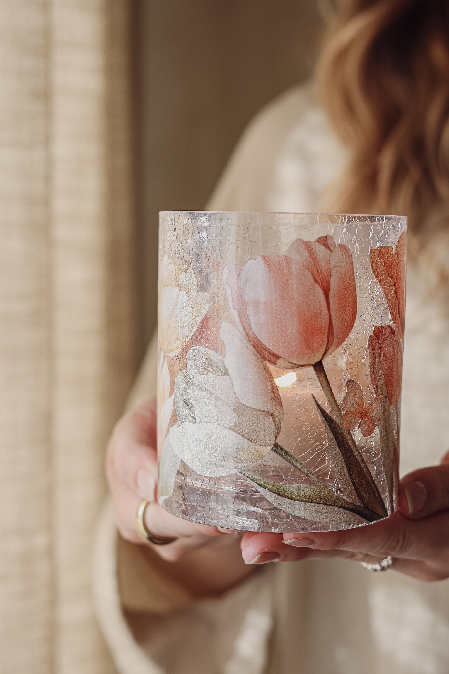 Vacker ljuslykta, handgjord i krackelerat glas och dekorerad med vackra tulpaner. Varje lykta är unik, med små variationer i glasets tjocklek och sprickor, vilket ger en charmig och levande känsla.
