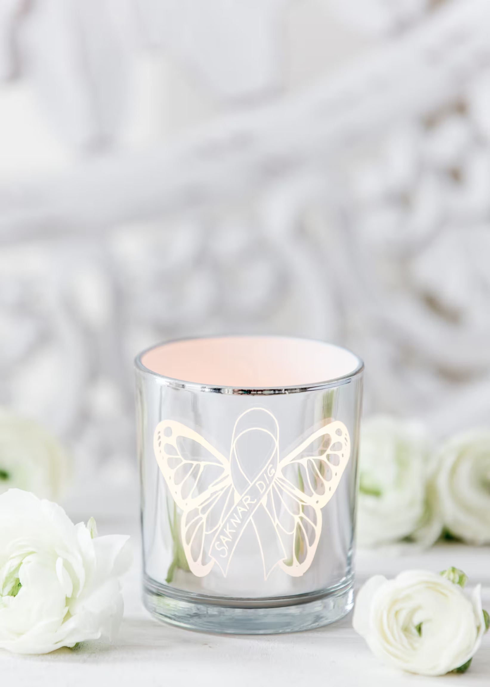 Ljuslyktan själv är tillverkad i transparent glas och har ett reflekterande yttre lager som fångar och återger ljuset på ett subtilt sätt. Detta ger ett mjukt skimmer när lyktan är tänd. På glasets yta finns ett utskuret motiv av en fjäril, vilket tillför ett detaljrikt element till designen. Mitt i fjärilsmotivet finns orden "Saknar Dig" ingraverade, vilket ger ljuslyktan en personlig och minnesvärd touch.