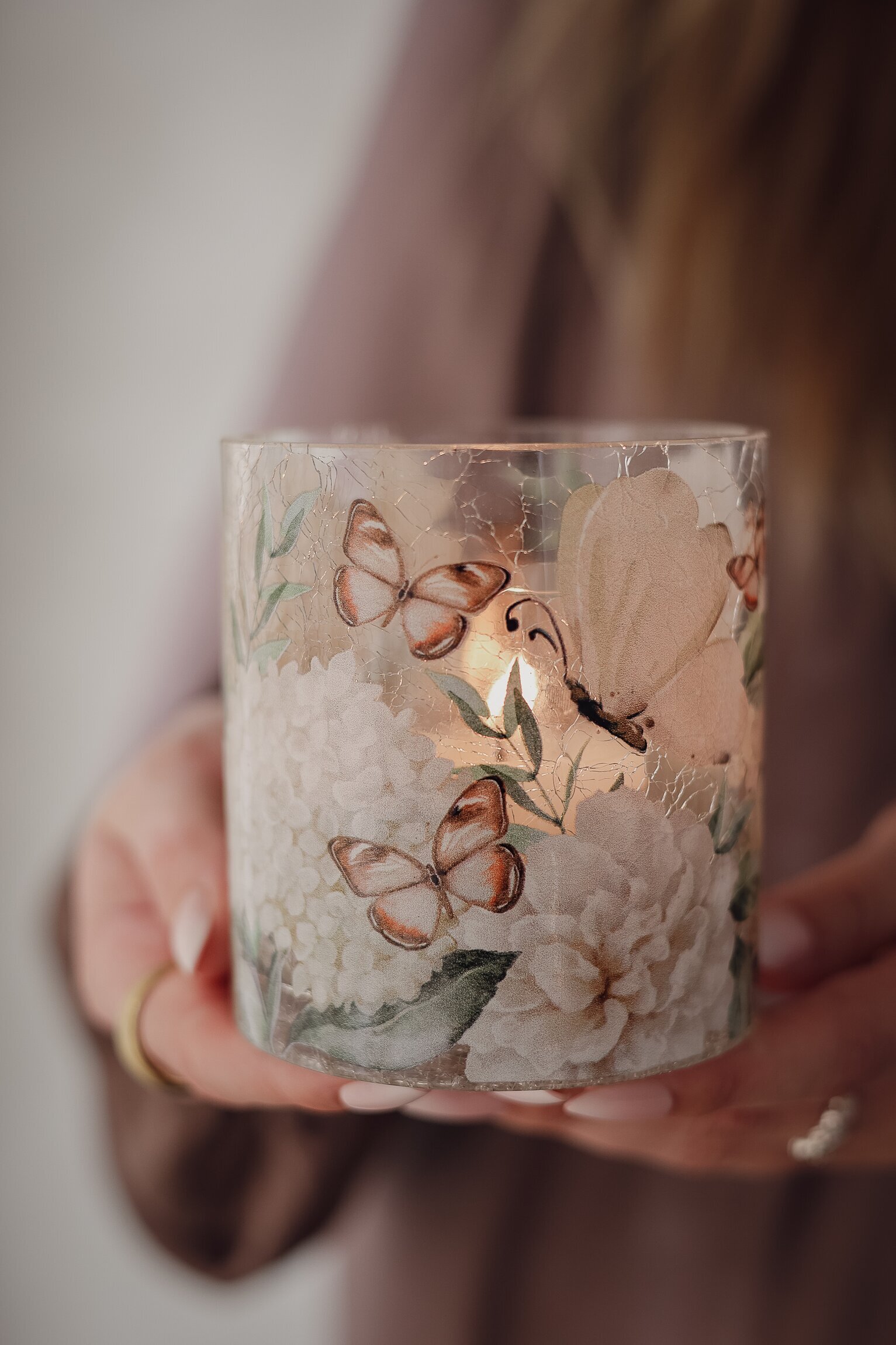 Majas vackra ljuslykta med hortensior och fjärilar skapar en varm och rofylld känsla i hemmet. Den handgjorda, krackelerade glasytan ger varje lykta ett unikt uttryck och det mjuka mönstret av blommor och fjärilar gör den lika fin tänd som släckt. En dekorativ detalj som passar lika bra på soffbordet som i fönstret eller på det dukade bordet.