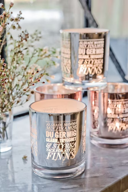 Den främsta lyktan i förgrunden har en ingraverad text som riktar sig till mödrar och uttrycker tacksamhet och kärlek. Texten är i vit färg och ger en fin kontrast mot den roséfärgade ytan, vilket framhäver budskapet på ett tydligt och iögonfallande sätt. Ljuset inom lyktorna ger ifrån sig ett mjukt sken, vilket bidrar till att förstärka den trygga och rofyllda känslan bilden förmedlar.