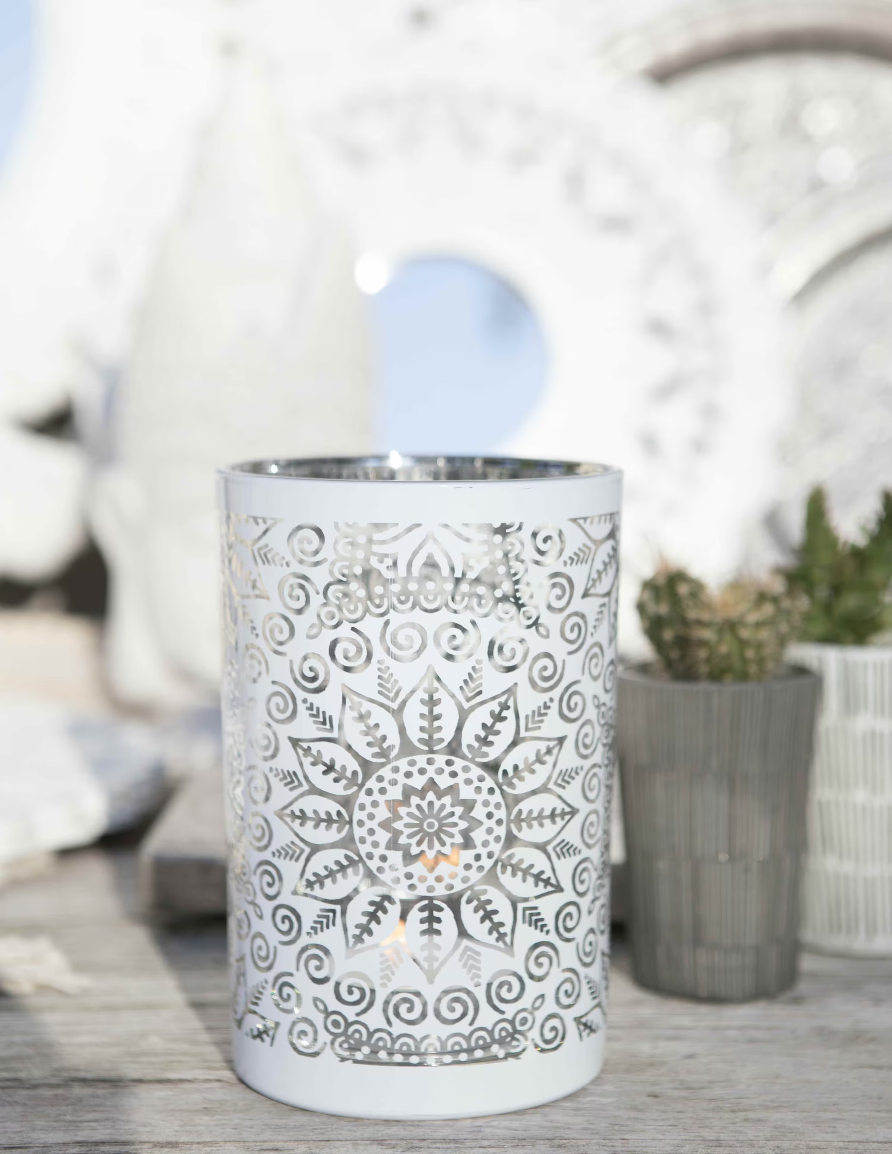 Vacker ljuslykta med vit utsida samt silvrig insida från Majas Cottage.