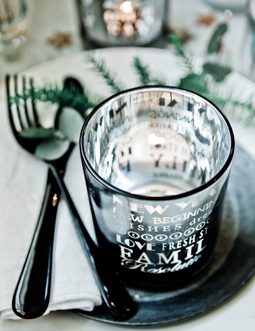 Lyktan är placerad på en rund, matt tallerken, vars yta kontrasterar mot lyktans blanka insida. Detta ger en intressant visuell dynamik. Den yttre ytan av ljuslyktan är utsmyckad med inspirerande ord och fraser som harmoniserar med nyårstemat, såsom "New beginnings" och "Family". Den svarta texten mot den ljusa ytan gör att orden framhävs, vilket gör dem till en central del av bildens komposition.