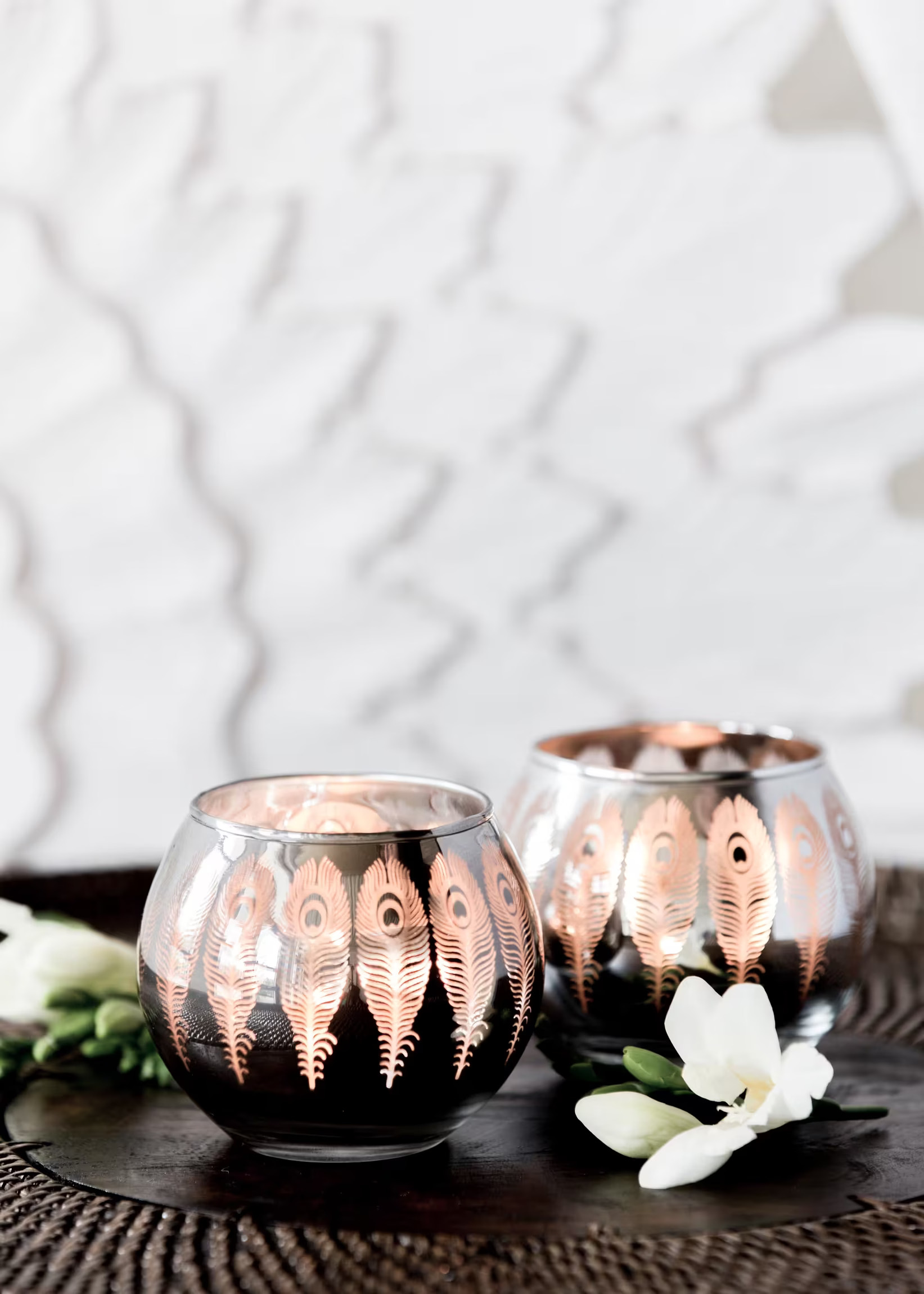 Bilden visar ett par ljuslyktor från varumärket Majas Cottage, som är en del av butiken Ljuslyktor.nu:s sortiment. Dessa lyktor, kända under produktnamnet Peacook 2 Ass från Majas Cottage, har en unik design inspirerad av påfågelns fjädrar, vilket framträder tydligt i deras detaljer. De rundade glaslyktorna är dekorerade med ett intrikat mönster som liknar påfågelfjädrar, vilket skapar en fascinerande effekt när ljus reflekteras genom dem.