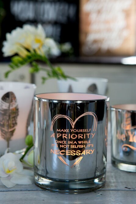 Bilden visar en elegant produkt från Ljuslyktor.nu, en butik känd för sina unika och stilrena ljuslyktor. Här syns en ljuslykta från Majas Cottage, som heter Priority. Denna specifika lykta är tillverkad av glas och har en metallisk yta som reflekterar ljuset på ett effektfullt sätt. På ytan av lyktan står en inspirerande text om att prioritera sig själv, inramad av ett subtilt hjärtmotiv som förhöjer dess estetiska tilltal.
