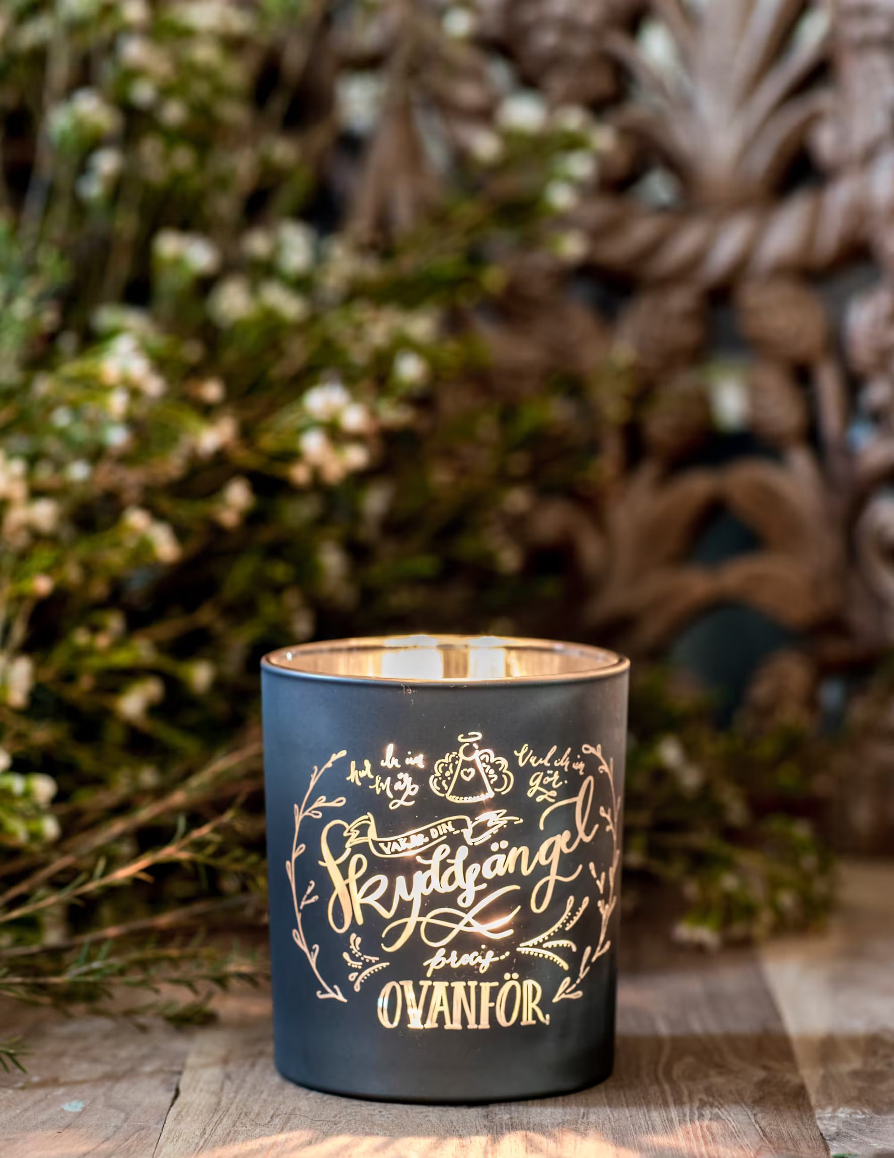 Ljuslyktan har en djup mullvadsfärg som ger den ett dämpat och sofistikerat intryck. På framsidan av lyktan finns ett dekorativt mönster och text som framträder i en kontrasterande ljus nyans. Texten är omsorgsfullt arrangerad i en konstnärlig stil som bidrar till lyktans visuella attraktion. Orden ”Skyddsängel precis ovanför” är centrala i designen och omges av små, delikata ornament som ger en känsla av handgjord detaljrikedom.