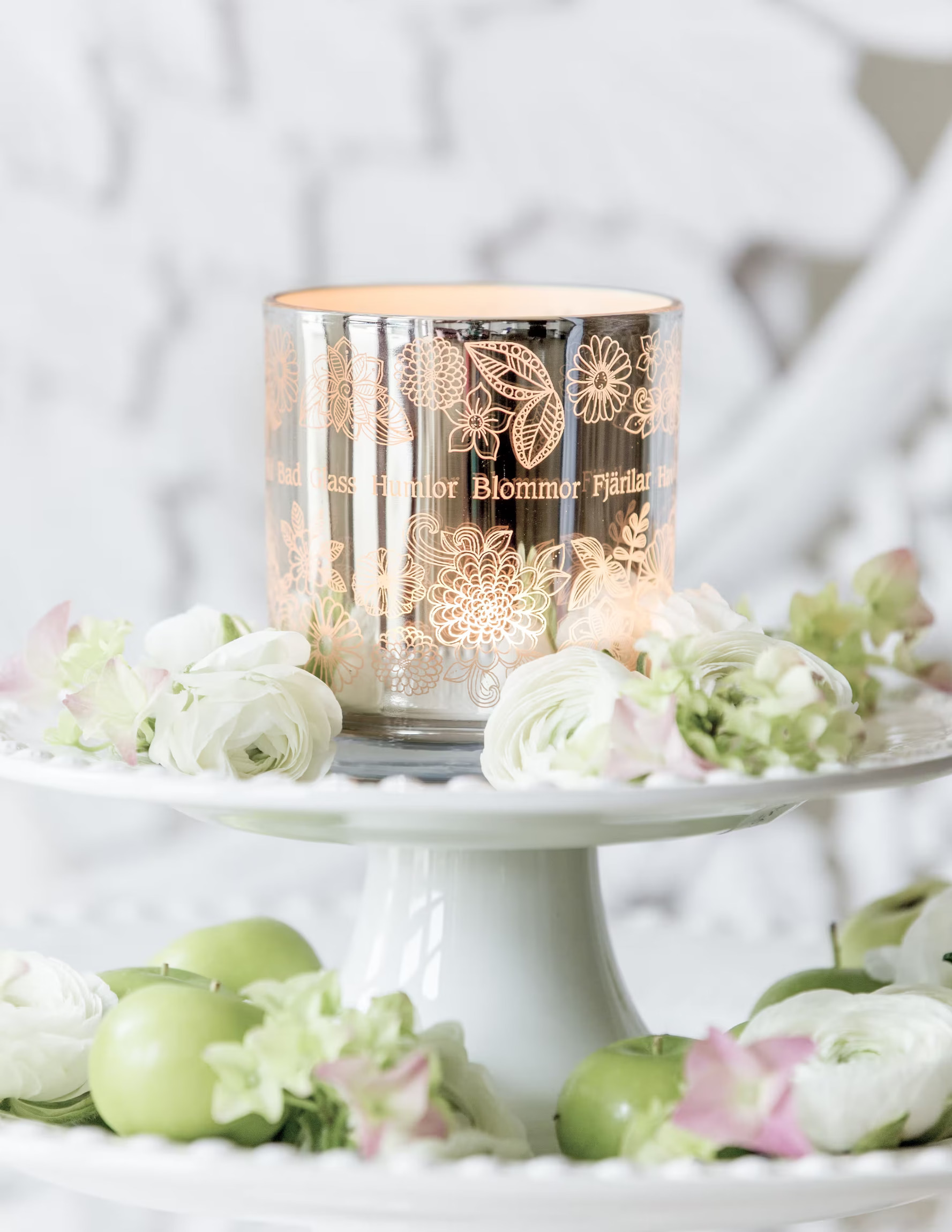 Ljuslyktan är placerad på ett vitt, upphöjt kakfat med två nivåer. Runt basen av fatet ligger vita blommor och ljusgröna äpplen omsorgsfullt arrangemang för att förstärka det somriga temat. Dessa detaljer skapar en frisk och neutral färgpalett som perfekt komplementerar lyktans design. Det ljus som tänds invändigt avger ett varmt sken, vilket reflekteras mot lyktans inre yta och förstärker mönstrens synlighet.