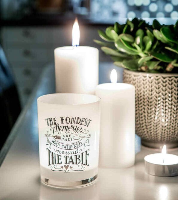 Bilden från Ljuslyktor.nu visar en stämningsfull inredningsmiljö med varma och inbjudande inslag. Centralt i bilden finns en cylinderformad ljuslykta från Majas Cottage, en del av deras produktlinje kallad The Table. Ljuslyktan har en frostad yta som sprider ett mjukt sken när den är tänd. Texten på lyktan lyder: "The fondest memories are made when gathered around the table," vilket förstärker den mysiga atmosfären.
