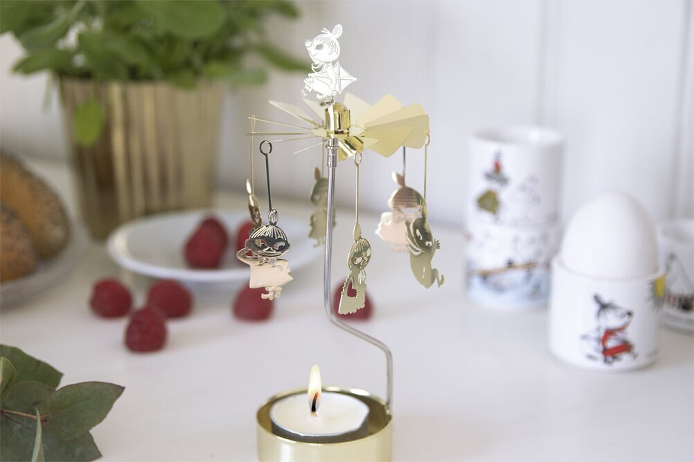 Stearinljuset, som sitter tätt under änglaspelet, är tänt och lågan brinner stabilt, vilket får de små figurerna att rotera sakta och skapa vackra skuggspel i omgivningen. Ljuset reflekteras i de gyllene delarna av produkten, vilket sprider ett subtilt och inbjudande sken omkring sig.