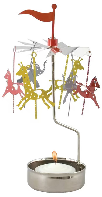 Karusellen bär på en uppsättning detaljerade figurer, där man kan se giraffer, hästar och elefanter hänga ner i en cirkel. Dessa figurer är gjorda av tunn, färgglad metall, med giraffer i en ljusgul nyans och hästar i röd färg, medan elefanterna är gråa. De är fästade i små krokar, vilket gör att de kan röra sig fritt när karusellen snurrar. Figuren av giraffen är särskilt detaljerad med prickar som ger en extra dimension till utseendet.