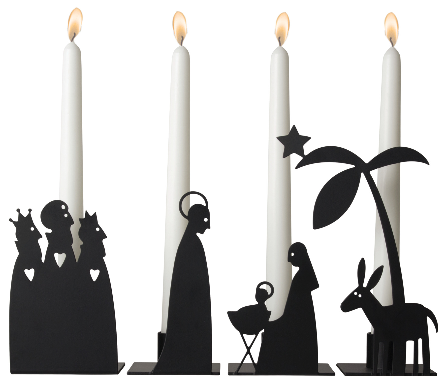 Vacker adventsljusstake i lackerad svart metall med motiv av krubban i Betlehem. Ljusstaken har 4 olika delar så man kan utöver som adventsljusstake även använda den som fristående ljusstake efter tycke & smak.