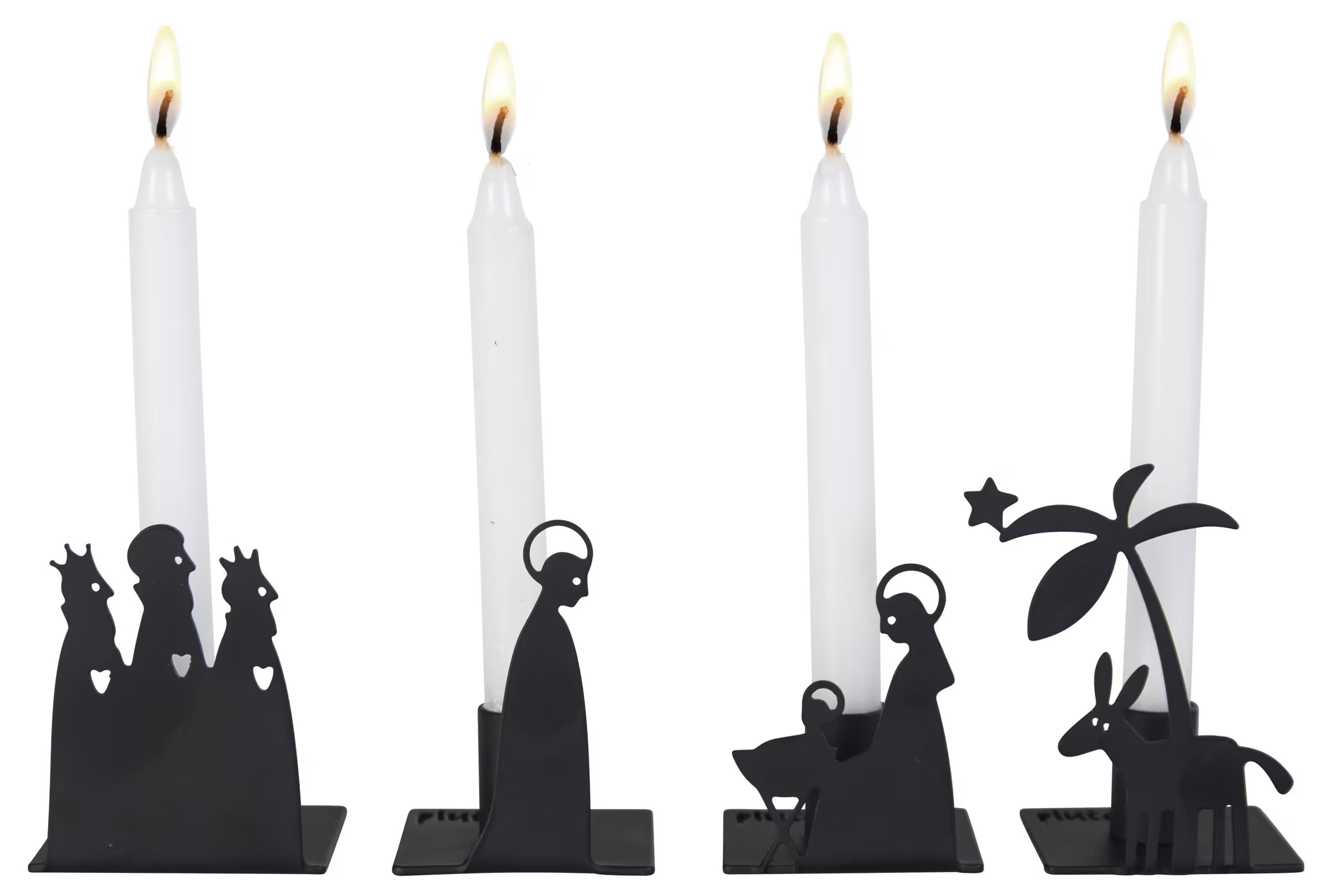 På bilden ser vi en uppsättning av fyra ljusstakar från Pluto Produkter, tillgängliga hos Ljuslyktor.nu. Denna specifika produkt, Ljusstake Krubba 4-Del Liten, framställs i form av en nativity-scen där varje ljusstake avbildar en ikonisk gestalt från julberättelsen.