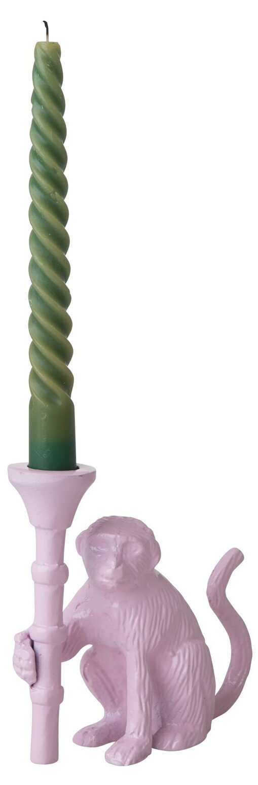 Bilden visar en unik ljusstake från varumärket Rice, tillgänglig hos Ljuslyktor.nu, specialisten på ljuslyktor och designartiklar. På bilden framträder en rosa ljusstake formad som en sittande apa. Apan håller stadigt i en vertikal del som efterliknar bambu, vilket fungerar som hållare för ett grönt ljus.