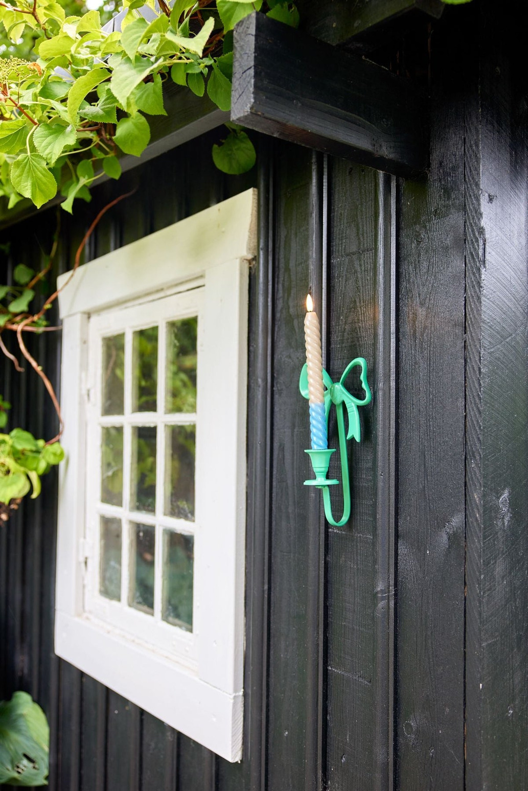 Bilden är tagen utomhus och visar en del av en träfasad i svart med vertikala panelbrädor. Intill ett litet fönster med vitmålade spröjsade rutor sitter en väggmonterad ljusstake från serien Rosett, skapad av varumärket Rice, och säljs hos Ljuslyktor.nu. Byggnaden har vitmålade fönsterkarmar som skapar en tydlig kontrast mot den svarta väggen. Ljusstaken är fäst nära fönstret, vilket förstärker dess närvaro i bilden. Över fönstret växer en grön klätterväxt med stora, frodiga blad som hänger ned över takkanten och slingrar sig delvis runt fasaden. Ljusstaken bär tydliga drag av rosett-designen, och dess yta är målad i en ljusgrön kulör. Designen visar en platt metallbåge böjd till en rosettform, vilket framhävs av det släta materialet och den symmetriska utformningen.