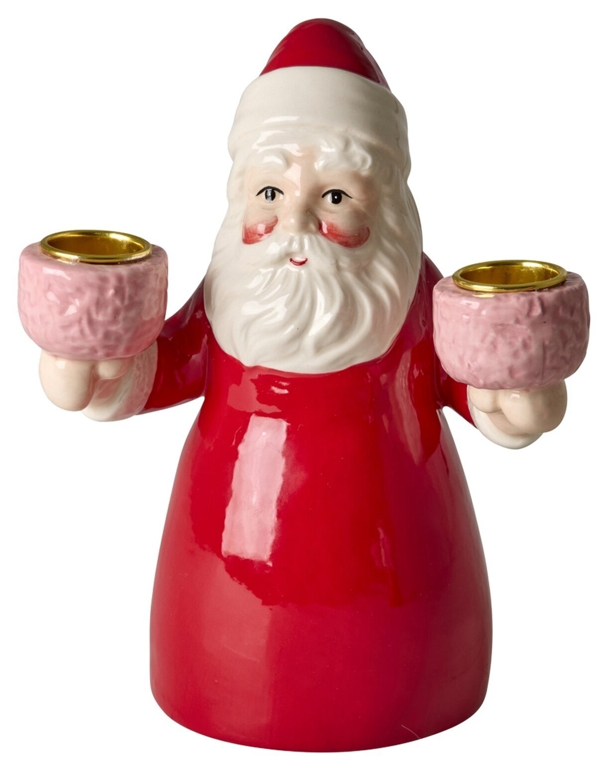 Sprid extra julglädje med denna charmiga tomte i keramik som har plats för två stycken kronljus. Med sitt vänliga uttryck och klassiska röda dräkt blir den en härlig dekoration på bordet, fönsterbrädan eller i julens dukningar.