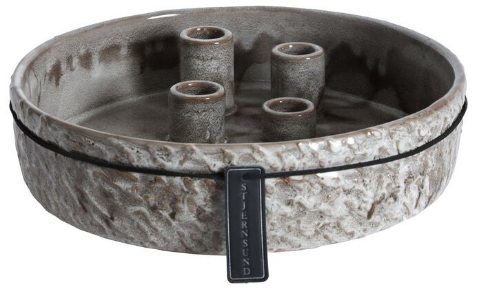 På bilden syns en ljusstake med namnet Stjernsund Natur/Brun, en produkt som finns i sortimentet hos Ljuslyktor.nu och representerar varumärket Silkflower. Ljusstaken har en rund form och är tillverkad i keramik, vilket ger den en solid och robust känsla. Dess yta har en naturlig och jordnära färgpalett, med olika nyanser av brunt som smälter ihop harmoniskt och ger ett levande utseende.
