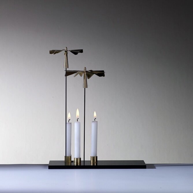 Änglaspel i en lite nyare tappning med 2 stycken snurror samt plats för 3 stycken ljus. Tillverkaren av detta änglaspel ville framkalla känslan som man hade som barn när man fascinerat stod och tittade på de vackra änglarna som snurrade ovanför ljusen. Detta änglaspel har dock inget plingande utan snurrar vackert i sin tysthet. Material: Svart MDF, stål samt mässing. Kommer förpackad i en fin presentbox inkl 3 stycken ljus.