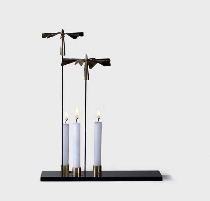 Ovanför ljusen finns två metallstänger som sträcker sig uppåt. Dessa stänger håller upp två snurrande element, formade som traditionella änglar, med sina vingar utsträckta. Änglarna är tillverkade i samma gyllene ton som ljusstakarna och blir automatiskt centrala i blicken tack vare deras placering och unika design. Ljusskenet från de brinnande ljusen skapar en atmosfärisk belysning som får änglarna att rotera, vilket ger en rogivande och fascinerande effekt.