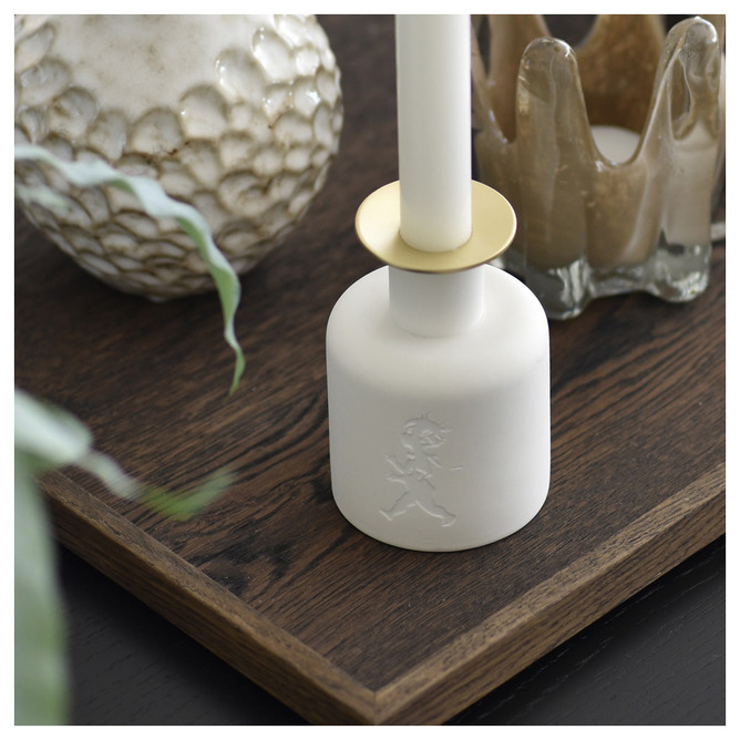 En elegant ljusstake i keramik som på ett harmoniskt sätt förenar form och funktion. Den medföljande ljusmanschetten i guld skyddar underlaget från stearin och ger samtidigt ett sofistikerat intryck. En tidlös inredningsdetalj som passar lika bra i vardagens lugn som till festdukningen.
