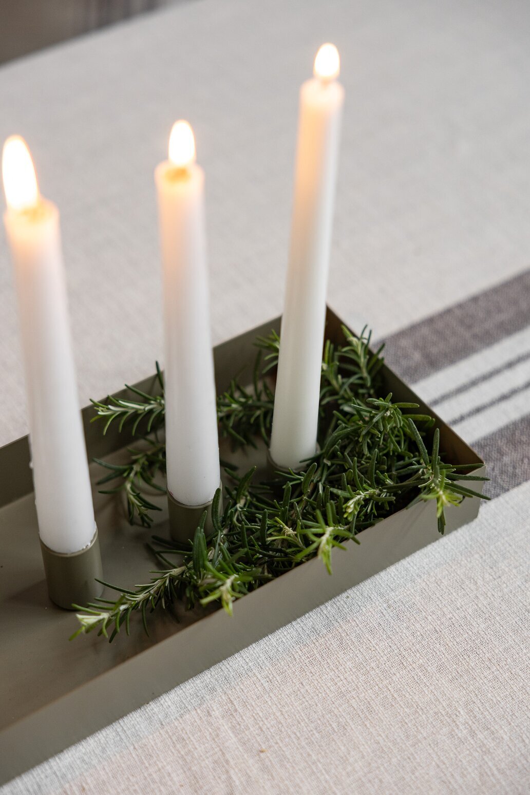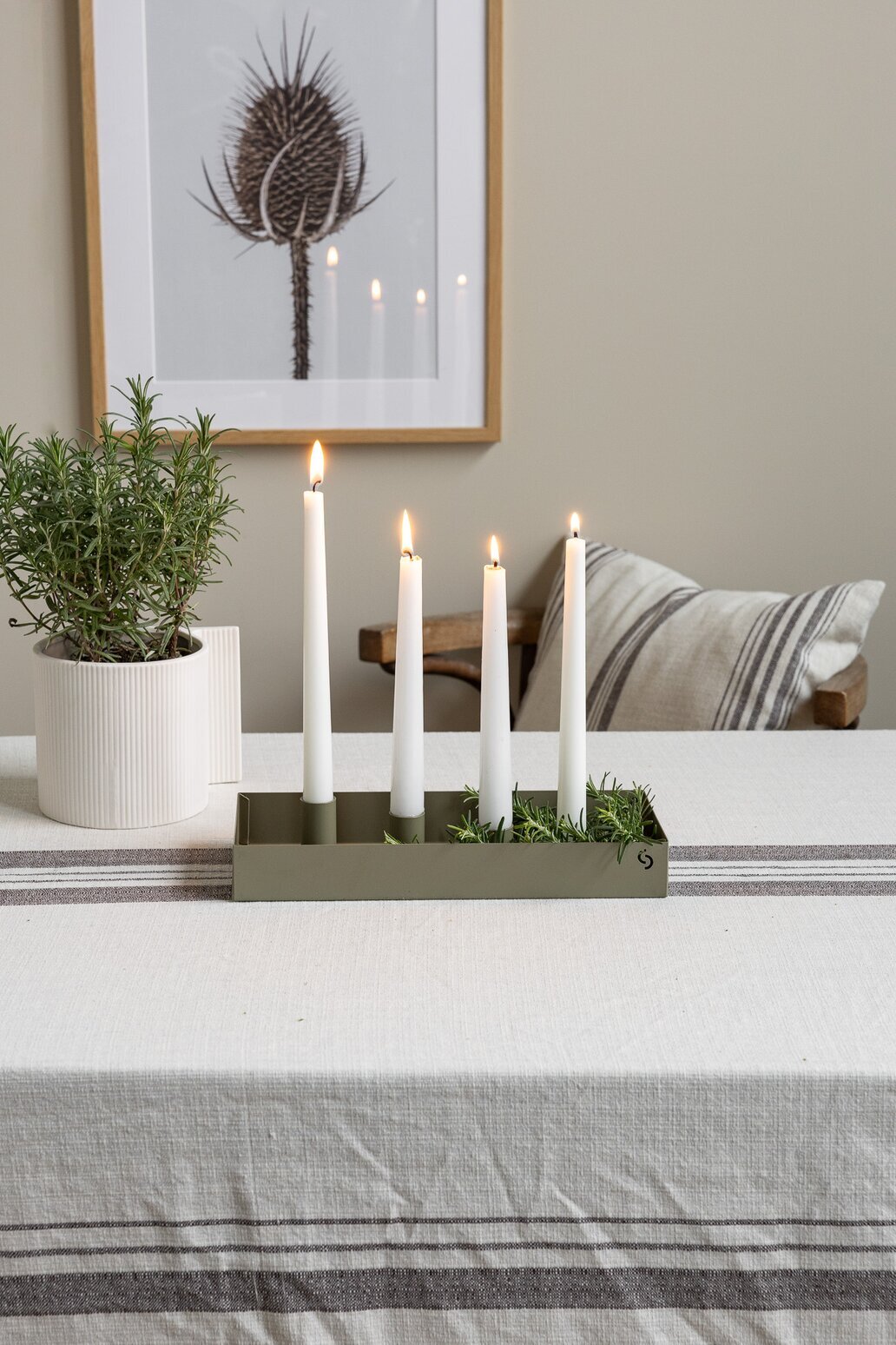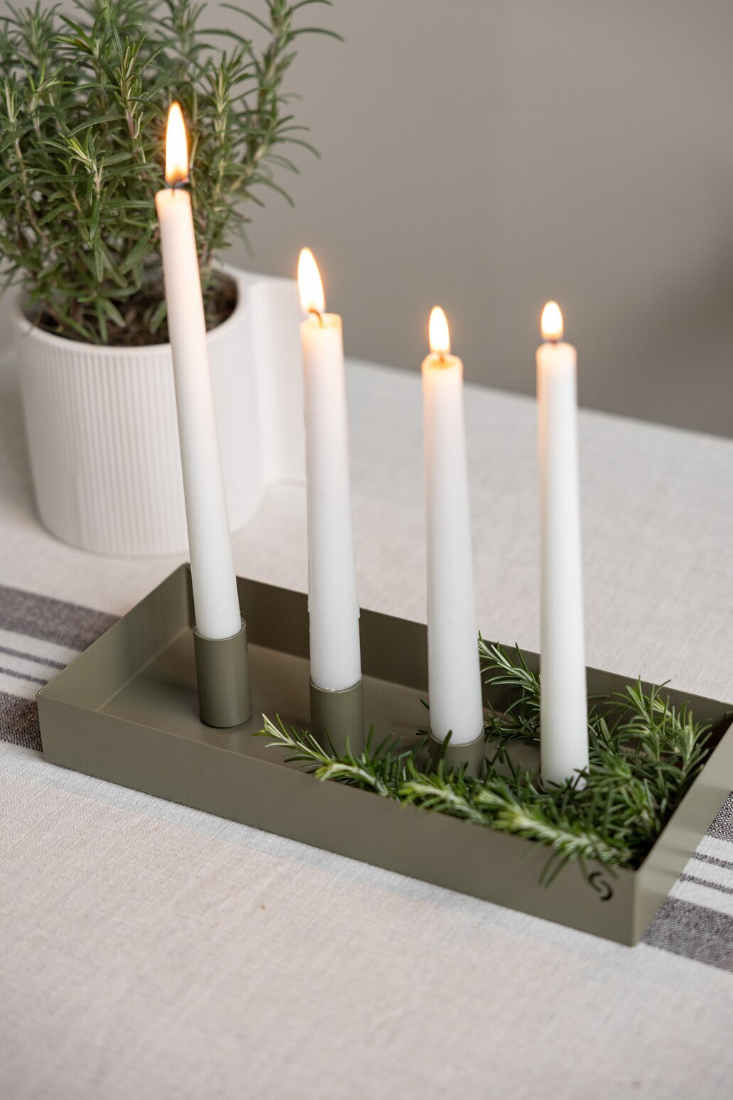 Stilren ljusstake i grön metall från Storefactory, med fyra magnetiska ljushållare som enkelt kan flyttas om. Den rektangulära formen gör den perfekt som mittpunkt på matbordet eller sideboardet.