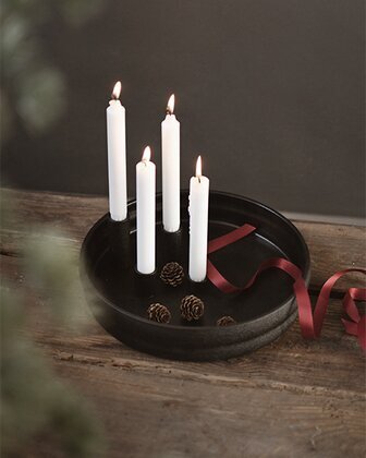 Ljusstaken är cirkulär och har en kant som ramar in en samling av vita, slanka ljus som står upprätta i själva staken. Fyra ljus är tydligt synliga, och de fladdrande lågorna bidrar med varmt ljus och en känsla av lugn. Ljusstakens yta har en mörk och matt finish som ger en kontrasterande effekt mot de rena vita ljusen.