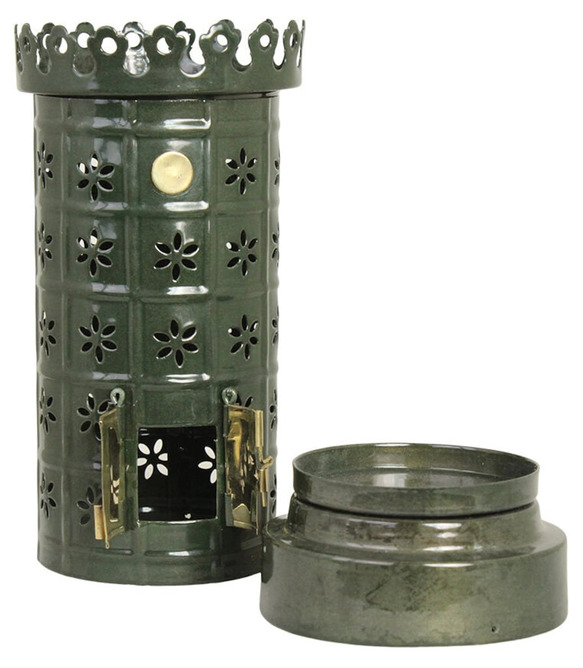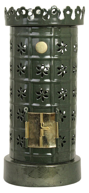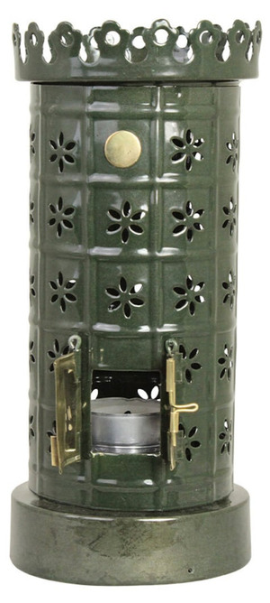 En dekorativ ljuslykta i grön plåt med utskurna blommönster som sprider ett varmt och stämningsfullt sken. Den är utformad som en liten kakelugn, där du enkelt lyfter av toppen för att placera värmeljuset inuti. De små mässingsdörrarna framtill blir en elegant detalj som förstärker känslan av klassisk kakelugn.