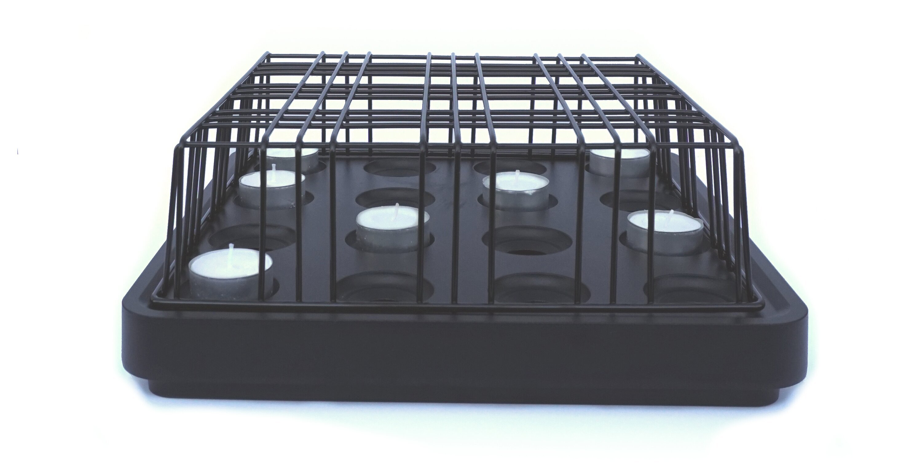 Metalldetaljerna runt ljusen bildar ett rutnät, vars raka linjer bidrar till en strukturerad estetik. Rutmönstret ger en känsla av symmetri och balans som kan passa i många olika inredningsstilar. Denna stängda struktur fungerar också som en säkerhetsåtgärd, som hindrar oavsiktlig beröring av ljusens lågor.