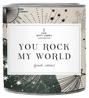 Mitt på framsidan finns en rektangulär etikett. Texten på etiketten är centrerad, tryckt med stora bokstäver och väl synlig. Den säger "You Rock My World" och förmedlar en positiv och upplyftande känsla. Under huvudtexten finns en mindre kursiverad text som säger "fresh cotton," vilket beskriver doften av ljuset.
