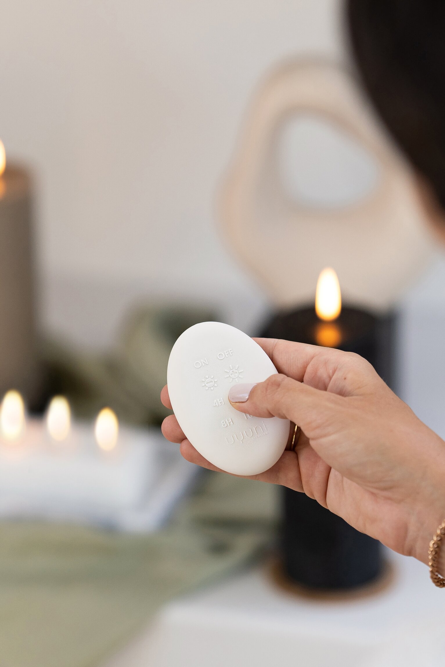 Bilden visar en elegant fjärrkontroll från varumärket Uyuni, som är en del av sortimentet hos Ljuslyktor.nu, en butik känd för sitt breda utbud av ljuslyktor. I förgrunden hålls den vita, ovala fjärrkontrollen vars mjuka, matta yta ger ett intryck av minimalistisk design och funktionalitet. Fjärrkontrollen har synliga knappar med tydliga symboler, inklusive knappar för att slå på och stänga av lampor samt tidsinställningar för fyra, åtta och tio timmar.