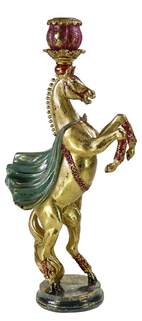 En dekorativ ljusstake i form av en stegrande häst med fina detaljer och klassiska färger i guld, vinrött och grönt. Kombinationen av den kraftfulla formen och de mjuka färgtonerna gör den till en inredningsdetalj som både känns elegant och personlig.