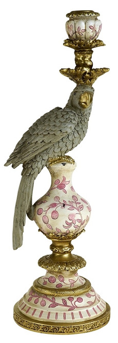 En ljusstake som för tankarna till klassiska salonger och tidlös elegans. Den vackra papegojan tronar stolt ovanpå den dekorativa basen med mjuka rosa mönster och antikguldfärgade detaljer. Kombinationen av fågelns eleganta silhuett och de handmålade, porslinsinspirerade formerna skapar en exklusiv och romantisk känsla.