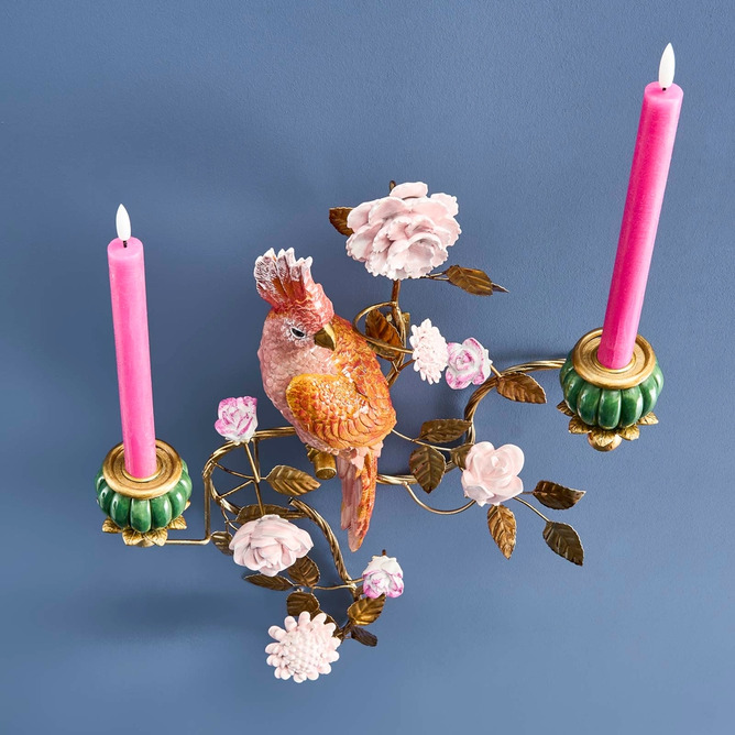 En riktig statement-pjäs för väggen. Den här dekorativa väggljusstaken kombinerar romantiska rosor, gyllene blad och en ståtlig rosa kakadua som stolt vakar över rummet. Kombinationen av mjuka pasteller och antikguldfärgade detaljer skapar en uttrycksfull och elegant känsla med en lekfull twist.